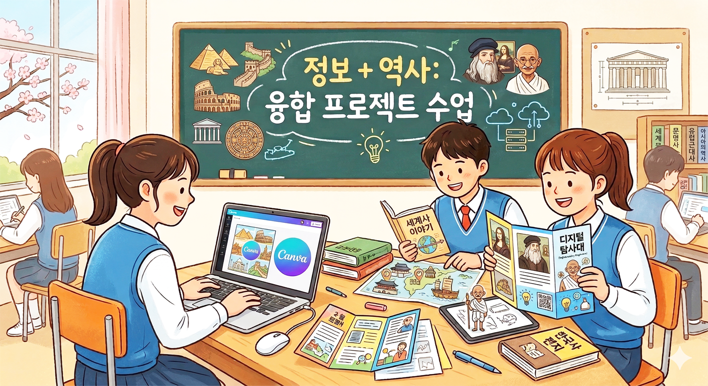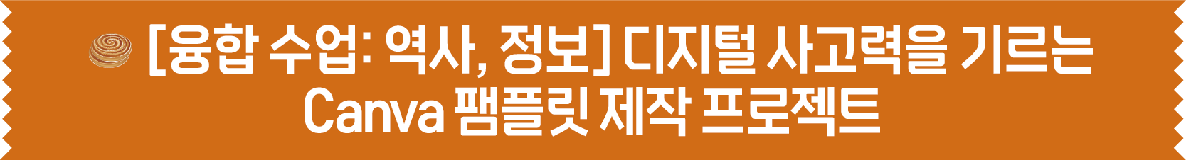 선생님, 혹시 역사 수업과 정보 교과가 만나면 어떤 시너지가 나는지 상상해 보신 적 있나요? 저는 여러 교과를 오가며 수업해야 하는 학교의 특성을 살려, 두 과목을 융합한 프로젝트 수업을 진행해 보았습니다. 단순히 역사 지식을 전달하는 것을 넘어, 학생들이 정보를 탐구하고 입체적으로 사고할 수 있도록 융합 수업을 기획했습니다. 아이들이 스스로 지식을 탐구하며 디지털 사고력을 뽐냈던 「Canva를 활용한 3단 팸플릿 제작 프로젝트」수업 사례를 선생님들께 공유합니다.